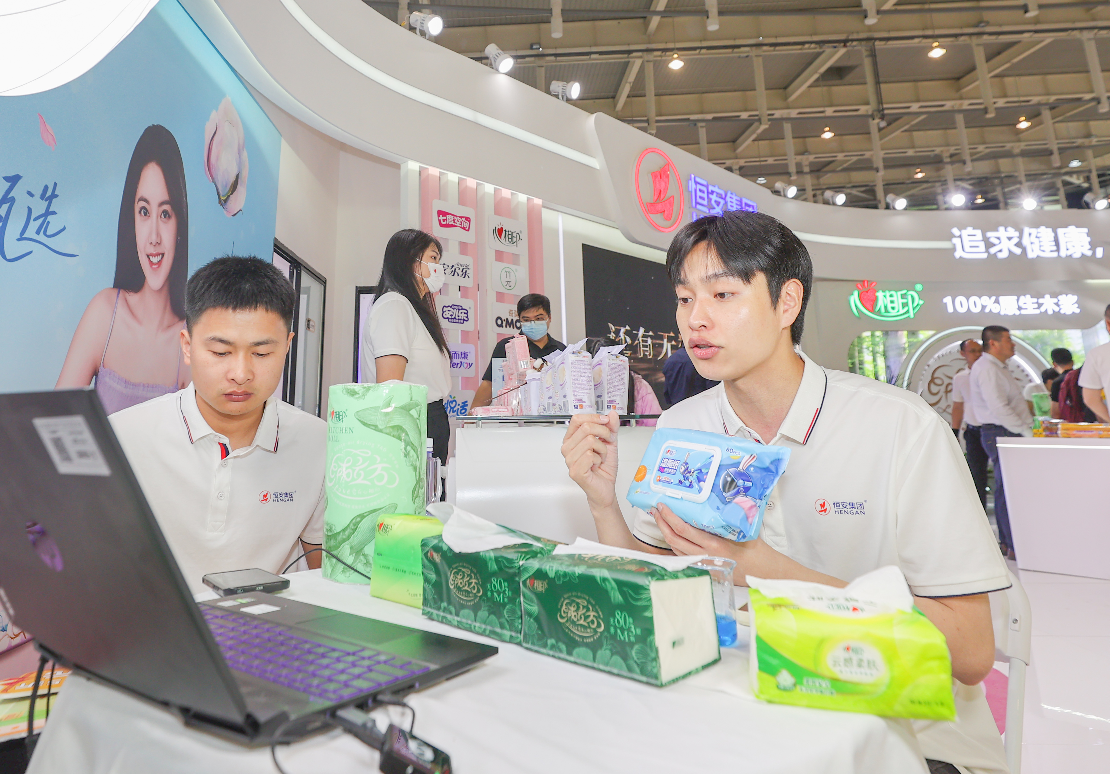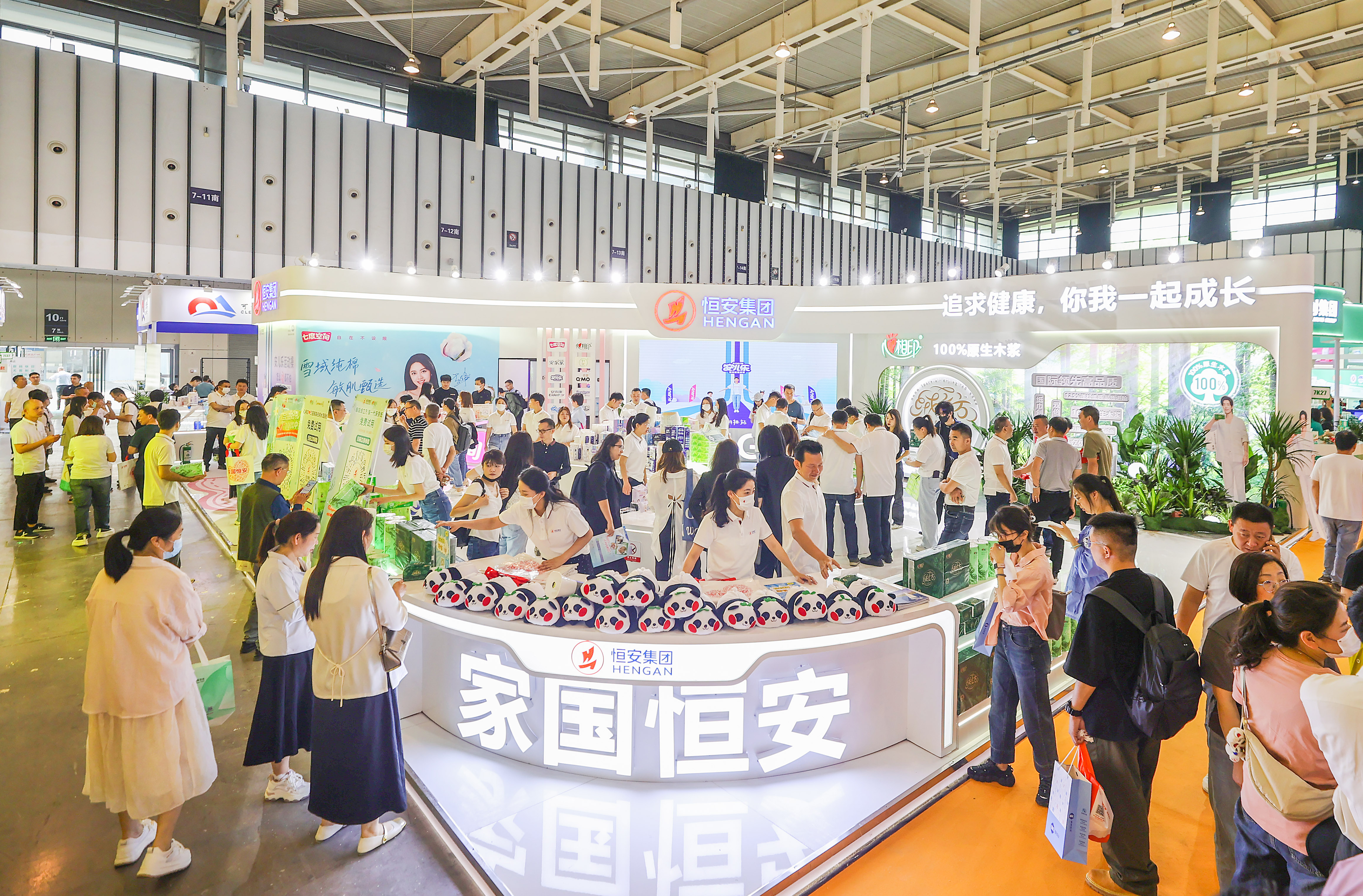 六合联盟本次设有心相印、七度空间、安儿乐等专区,展位中间以集团logo造型设计的展台承载全系产品,纸品、卫品、尿裤、家居等产品悉数亮相。